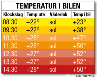 Det behövs inte så höga temperaturer ute för att det ska bli varmt i en parkerad bil. När värmen stiger blir bilen lätt en dödsfälla. Snabbare än många tror höjs temperaturen i bilen, oavsett om den står i sol eller skugga. Det hjälper föga att dra ner en eller flera rutor. När luften står stilla och värmen stiger över 25 grader hjälper inte ens en öppen baklucka som ventilation för en flåsande hund. Luftcirkulationen blir ändå otillräcklig och temperaturen alldeles för hög. Hunden kan då komma i chock och dö om den inte omedelbart kommer under veterinärvård.