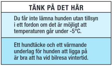 TÄNK PÅ DET HÄR!Att man inte ska lämna sitt husdjur i bilen på sommaren har nog de flesta hört, men man ska inte heller lämna sin fyrbenta vän i bilen på vintern. Hunden eller katten kan bli nedkyld och det kan få förödande konsekvenser.